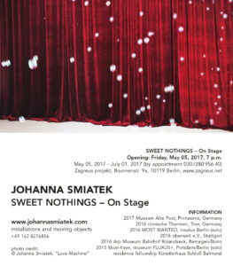 Johanna Smiatek works especially in the field of interactive and kinetic art. Many works are “moving objects” (a term she has used since 2000) and sculptures. These works are complemented by many drawings. A further aspect of her artistic work are graphical wallpaintings, which often form a three-dimensional installation in space. In her work Johanna Smiatek refers to ordinary subjects, but changes these subjects in delicate dealing. Everyday objects are subtly transformed, their essence taken to absurd extremes. Objects originating in, or reminiscent of, the everyday world are cast in silicone and set in vibration by an electric motor specifically developed by the artist. The various objects, whether shoes, oversized lipsticks or mirrors, develop a subtly independent life. This staged trembling of the objects speaks about the human experience of self and of the body, but simultaneously calls it into question. Feelings of familiarity and strangeness are evoked, an ambivalence between exhilaration and insecurity. It is this, which gives the work its singular appeal. In her recent works the light, the digital control of light, the medium of video and sounds are essential parts, mostly in interaction with the beholder.